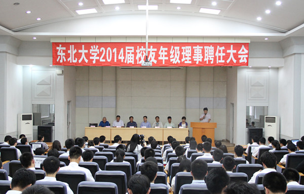 6月17日下午,我校2014届校友年级理事聘任大会在图书馆4楼学术报告厅举行。东北大学沈阳校友会会长、原辽宁省贸促会会长李瑞,东北大学鞍山校友会会长、鞍山市纬达房屋开发有限公司总经理蔡春景,东北大学营口校友会会长、营口摩迪液压润滑设备有限公司总经理温连庚,东北大学校董会常务董事、东北大学香港校友会副会长、香港凯富泰公司董事长周��,东北大学加拿大校友会副会长高秀山,东北大学党委副书记、纪委书记、校友总会副会长杨明,校友总会秘书长、办公室主任李鹤,校友总会副秘书长、办公室副主任王晓英及2014届校友年级理事代表出席大会。