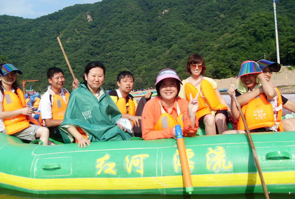 7月26日,东大沈阳校友会QQ群(47744196)一行60余人,在沈阳校友会大旗冽冽飘扬中,驶向著名风景区红河谷。 活动的口号是“向快乐进军”,活动从报名开始就显示了广大校友的热情,10人,20人,30人,原定的45人团迅速爆满,陆续报名的校友还在增加,为了让校友们都能玩的愉快,玩的尽性,临时调整了旅游大巴车,从45座到49座,又从49座到53座,最后由于校友们的热情实在太高,又临时增加了一辆小巴车。校友们给活动起了个生动的名字“东大海盗团”,由于不少校友第一次参加活动,大家逐个自我介绍,表演才艺,一路上欢歌笑语,原本陌生的彼此,很快的溶入这快乐的海洋中。