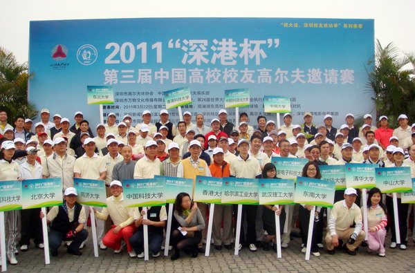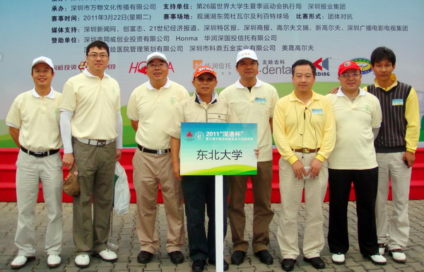 3月22日,由深圳市高尔夫球协会和中国高校校友高尔夫球俱乐部联合主办的2011“深港杯”第三届中国高校校友高尔夫邀请赛在深圳观澜湖球场开赛,清华大学、北京大学等大陆高校和来自香港的香港大学和香港科技大学共计25所高校校友代表参加了此次赛事。我校代表队以深圳校友会陈伯君会长为队长,与深圳的邓建球、潘宁川、刘勇、杨俊、杨波和来自广州的孙建生、北京的付越等校友共同组成了东北大学校友高尔夫球队。中南大学获得冠军。