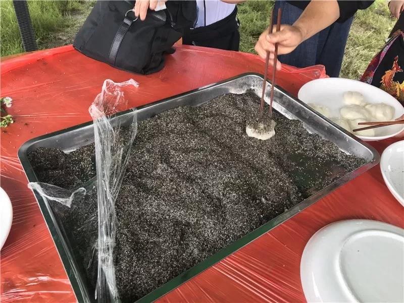 畲族阿姨们把打好的糍粑反复翻面,十分钟后,客户们都上来捏一个面团,放到芝麻粒中,滚一滚。芝麻的香味包裹着糍粑,咬在嘴里,一口一口,根本停不下来。