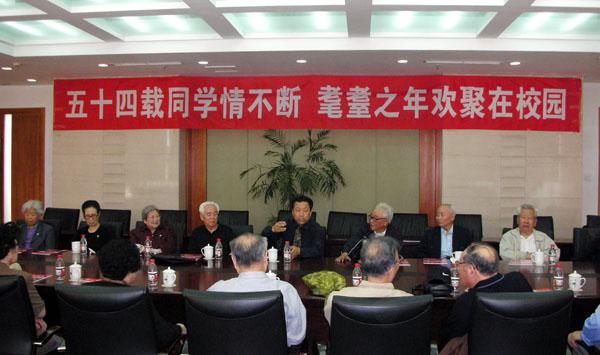汉卿会堂三楼会议室是接待贵宾的会议室。当我们走进会议室,看到专为我们挂的一条醒目的“五十四载同学情不断,耄耋之年欢聚在校园”的横幅,立即吸引了我们的目光。座谈会上魏主任首先代表学校领导和校友总会,向回校参观访问的校友们表示热烈欢迎和问候!接着详细地介绍了东大发展的历程和学校近十年来的跨越式的发展以及光辉的前景。座谈时,我们首先对母校的深情问候和热情接待表示衷心的感谢和敬意!同学们在谈回校的感受时说:“我们在母校的大学时代是我们一生中非常难忘的时刻。因为当时我们正处于跨入新社会不久,人生观、世界观急需改造的时期,许多基础知识和专业能力还不充实。经过母校几年的辛勤培育才使我们有了根本的转变和提高。毕业时能坚决服从祖国分配,满怀豪情壮志奔赴祖国各地,无私地工作和拼搏,为祖国社会主义的建设事业贡献了一生。”抚今追昔,情不自禁地对当时院系领导、培养我们的老师和朝夕相处现已逝世的同学慕然升起缅怀之情,为他们起立默哀。同学们也谈到为母校近些年来在教学、科研、学科建设及校园建设等方面取得的巨大进步受到极大鼓舞,更希望母校在努力把学校办成全国一流、世界闻名的现代化学府的康庄大道上阔步前进!