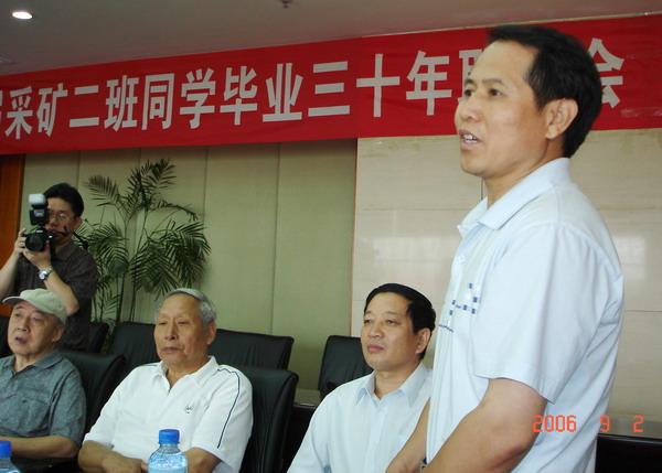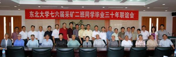 二00六年九月二日上午八时三十分,七三级采矿二班同学在东北大学汉卿会堂举行毕业三十年座谈会。东大校友总会办公室李鹤副主任、校友总会联络部王晓英部长,资土学院王恩德院长、左斌书记,采矿工程研究所孙豁然所长,当年任教的王振生、解世俊、王金波、赵铁城、郑永学、张云嵩、张晶瑶、杜芳彦、蔡守忠、李恩焕、王国士老师参加了座谈会。会上首先由领导们分别介绍学校,学院,采矿专业三十年的发展,再由同学们分别介绍各自三十年工作情况。会议气氛热烈,师生踊跃发言,共诉师生情意。座谈会后,同学们在校友总会李鹤副主任、校友总会联络部王晓英部长的陪同下参观了校史及老校长展览。