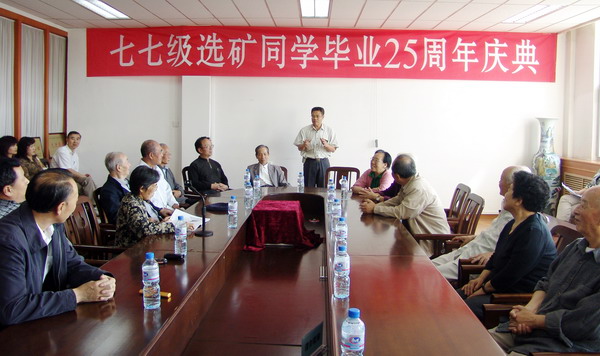 庆典上,77级选矿班的第一任辅导员、校离退休党委书记冯跃兵、77级选矿同学毕业时的班主任陈贵宾老师、校友总会主任魏向前、资土学院党委书记左斌、校党委书记孙家学先后作了热情洋溢的讲话。77级选矿班班长高明炜拿出了珍藏的全班35名同学在毕业时的研究课题,他结合选矿25年的发展过程,证明了当年老师们为我们选的课题很有前瞻意识,可谓寄予厚望。他代表同学表示,77级选矿同学永远不会忘记老师为培养学生而付出的心血。