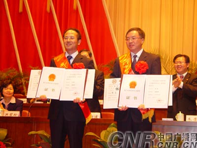 庄志刚校友(左)荣获2005年厦门市科技重大贡献奖