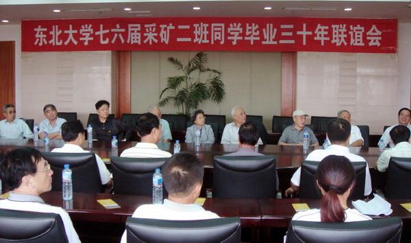 二00六年九月二日上午八时三十分,七三级采矿二班同学在东北大学汉卿会堂举行毕业三十年座谈会。东大校友总会办公室李鹤副主任、校友总会联络部王晓英部长,资土学院王恩德院长、左斌书记,采矿工程研究所孙豁然所长,当年任教的王振生、解世俊、王金波、赵铁城、郑永学、张云嵩、张晶瑶、杜芳彦、蔡守忠、李恩焕、王国士老师参加了座谈会。会上首先由领导们分别介绍学校,学院,采矿专业三十年的发展,再由同学们分别介绍各自三十年工作情况。会议气氛热烈,师生踊跃发言,共诉师生情意。座谈会后,同学们在校友总会李鹤副主任、校友总会联络部王晓英部长的陪同下参观了校史及老校长展览。