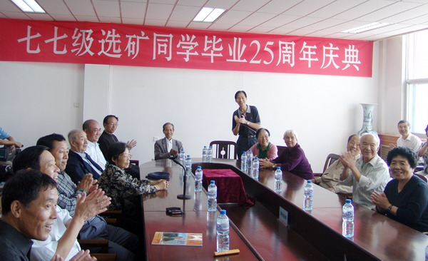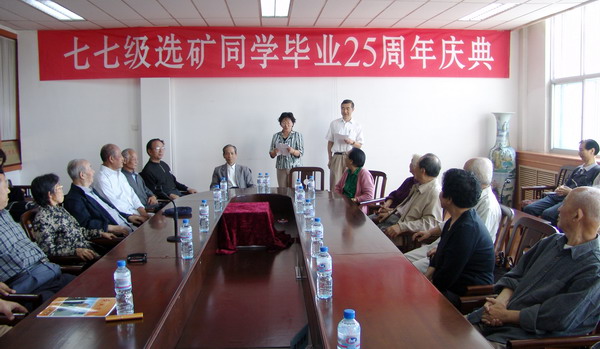 庆典上,77级选矿班的第一任辅导员、校离退休党委书记冯跃兵、77级选矿同学毕业时的班主任陈贵宾老师、校友总会主任魏向前、资土学院党委书记左斌、校党委书记孙家学先后作了热情洋溢的讲话。77级选矿班班长高明炜拿出了珍藏的全班35名同学在毕业时的研究课题,他结合选矿25年的发展过程,证明了当年老师们为我们选的课题很有前瞻意识,可谓寄予厚望。他代表同学表示,77级选矿同学永远不会忘记老师为培养学生而付出的心血。