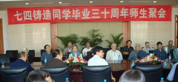七四铸造专业二十多名校友于9月21日从全国各地回到母校东北大学,参加毕业三十周年聚会活动。9月22日上午在汉卿会堂与原任课老师见面.邀请了铸造教研室和部分基础课老师近二十位参加了座谈会.东北大学校友总会秘书长魏向前出席并讲话。魏秘书长向校友们介绍了母校三十年来,特别是复校以来东北大学的发展变化,源远流长,情深意切,校友们深受鼓舞,为母校的发展感到骄傲。校友们也分别介绍了毕业三十年来个人的工作。在不同的工作岗位上兢兢业业,努力工作,为党和国家贡献了自己的聪明才智,把在学校学到的知识回报给社会,回报给人民。