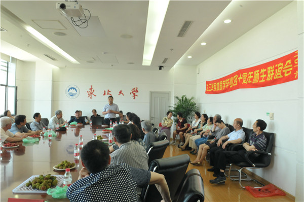 约十时许,联谊会在校办公楼会议室隆重举行,东北大学校友总会秘书长李鹤及半导体专业领导、老师,校办厂老师、师傅和同学等42人出席。李鹤秘书长代表学校致欢迎词,并介绍了学校四十年来的发展历程,专业领导、老师先后讲话,共同为同学们毕业后走向工作岗位,发挥专长,奉献青春,回报社会、母校和老师,而感到欣慰和自豪。同学们逐个发言,回顾了自己的工作阅历,分享了人生感悟,对祖国、党、母校和老师的感恩之情溢于言表。毕业以后同学们铭记“自强不息,知行合一”的校训,不忘全心全意为人民服务的宗旨,四十年如一日,兢兢业业,诚实肯干,勇于开拓创新,在平凡的工作岗位都取得了不凡的业绩。据不完全统计,撰写发表论文论著二十余篇(本);荣获市、省部级科技进步奖五项;一人荣获国务院突出贡献特殊津贴;多人多次立功受奖;多人多次被评为优秀党员、优秀科技管理工作者;同学们在不同的岗位成为教授、副教授、高级工程师、企业家、国家干部等有用人才。