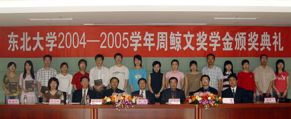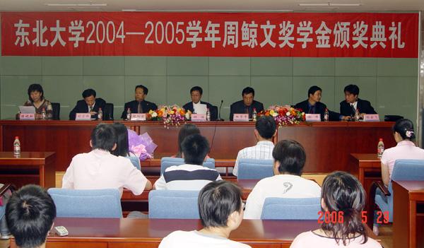 东北大学2004―2005学年周鲸文奖学金颁奖典礼于5月29日下午4时在汉卿会堂402会议室隆重举行,张小诗等16名优秀学生获奖。
