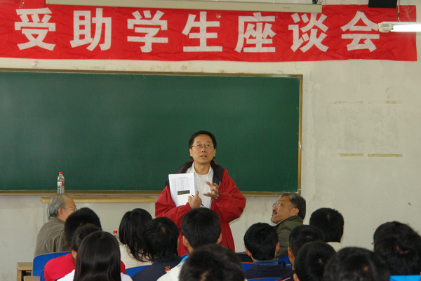 2007年10月15日,2007年度周��爱心资助金的受助学生与资助金的设立者――香港凯富泰有限公司总经理周��先生,在东北大学基础学院主楼123教室进行了座谈。出席座谈会的还有周��先生的好友、爱心资助金的资助人之一史天佑先生,原沈阳市侨联主席刘保平先生。另外,出席座谈会的还有东北大学学生指导服务中心程振东老师和郑泽萍老师。