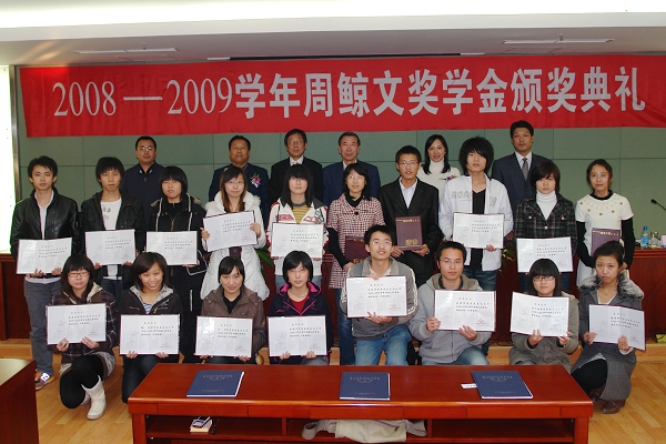 11月5日下午,2008――2009学年周鲸文奖学金颁奖典礼在汉卿会堂402会议室举行。原东北大学代校长周鲸文之子、校董会常务董事、香港凯富泰有限公司总经理周��先生,张学良教育基金会香港有限公司高级顾问蔡展翔女士,副校长王宛山以及校友总会、研究生院的有关负责人出席了颁奖仪式。蔡妮娜等18名同学荣获2008――2009学年周鲸文奖学金。