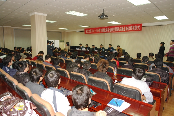 11月4日,2008-2009学年建龙奖学金颁奖暨建龙基金协议续签仪式在学生活动中心200室举行。北京建龙重工集团有限公司副总经理李术东先生、我校副校长王宛山出席仪式,共同为获奖学生颁奖,并在《东北大学建龙基金协议》和《张学良教育基金会捐赠协议》上签字。