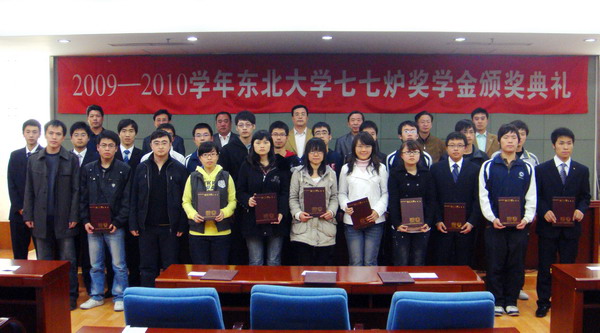 颁奖典礼由东北大学学生工作处副处长刘云飞主持。王坤等23名学生获得东北大学2009-2010学年“东北大学七七炉奖学金”。