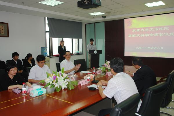 6月8日下午,东北大学文法学院周鲸文奖学金颁奖仪式在综合楼11楼会议室举行。原东北大学代校长周鲸文之子、校董会常务董事、东北大学文法学院周鲸文奖学金捐资人、香港凯富泰有限公司董事长周��,东北大学校友总会、张学良教育基金会、校董会办公室副主任李鹤,文法学院院长张雷、文法学院党委书记杨建春、文法学院党委副书记兼副院长司晓悦参加了颁奖仪式。仪式由文法学院副院长王海涛主持。