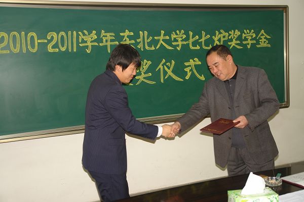 12月9日下午3时,2010-2011学年东北大学七七炉奖学金在冶金馆244颁发。七七炉校友陈文仲教授代表所有校友为韦梦祺等22名获奖同学颁发了获奖证书。