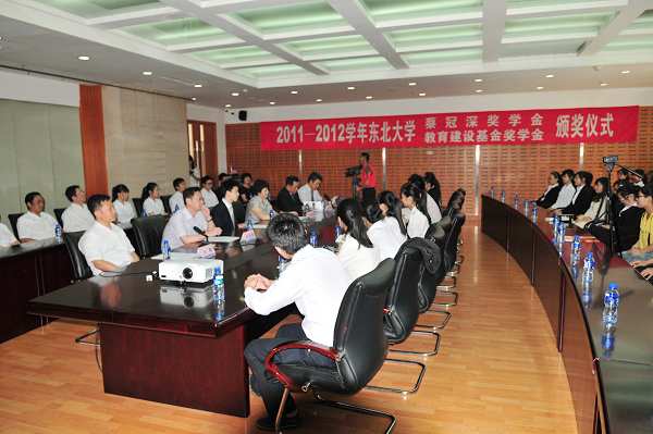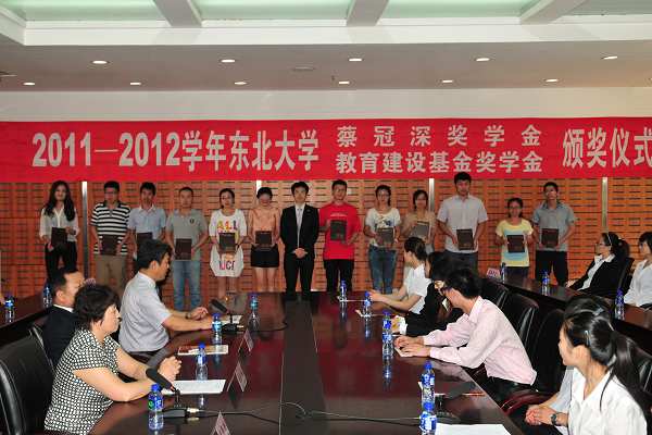 会见结束后,2011―2012学年东北大学蔡冠深奖学金、教育建设基金奖学金颁奖仪式在汉卿会堂308会议室举行。蔡隽思、熊晓梅出席了颁奖仪式。蔡隽思为刘美�|等46名获奖学生颁奖。