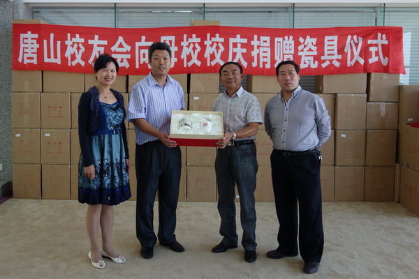 8月31日上午,唐山校友会秘书长邵大华、李金明校友一行,代表东北大学唐山校友会为母校九十周年校庆捐赠瓷具。校友总会办公室主任李鹤、副主任王晓英,代表学校接受了捐赠。