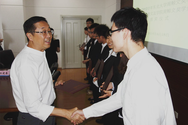 6月18日下午,东北大学2012-2013学年周鲸文奖学金、2014年度文法学院周鲸文奖学金颁奖仪式在综合楼1304会议室成功举办。东北大学校董会常务董事、萱草基金创始人、东北大学代校长周鲸文之子周��先生,先生文法学院党委书记杨建春,东北大学校友总会办公室主任李鹤,东北大学校友总会办公室副主任王晓英以及获奖学生参加了本次颁奖仪式。姜河等18名同学获得东北大学周鲸文奖学金;刘丰筠等5名同学获得文法学院周鲸文奖学金。颁奖仪式由王晓英主任主持。