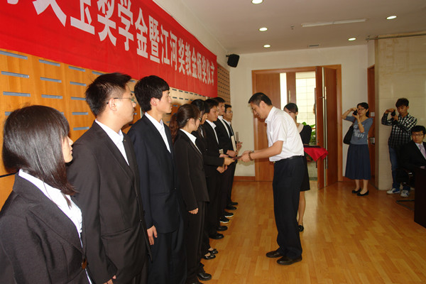 学校有关部门负责人介绍了东北大学刘大阶方文玉奖学金暨江河奖教金设立情况。学生处、人事处相关负责人分别宣读了2012-2013学年东北大学刘大阶方文玉奖学金获奖名单和2013年度江河奖教金获奖名单,王鑫等52名同学获得2012-2013学年刘大阶方文玉奖学金,张鑫等10名同志获得东北大学2013年度江河奖教金。