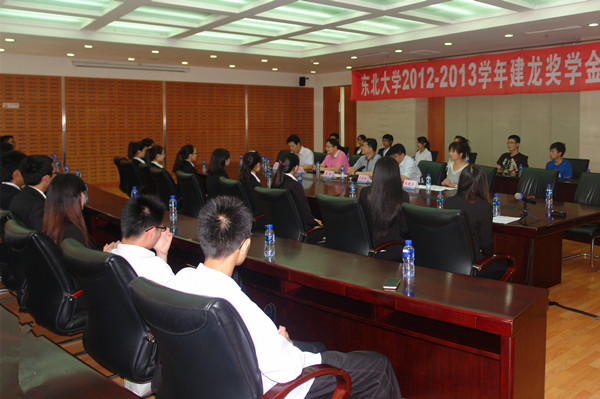 会上,校友总会、校董会、基金管理办公室相关负责人宣读了2012-2013学年“东北大学建龙奖学金”获奖学生名单。杨明、宋亚庆等与会领导和嘉宾为获奖学生颁发证书。材料与冶金学院2012级学生贾丽敏作为建龙奖学金获奖学生代表发言。
