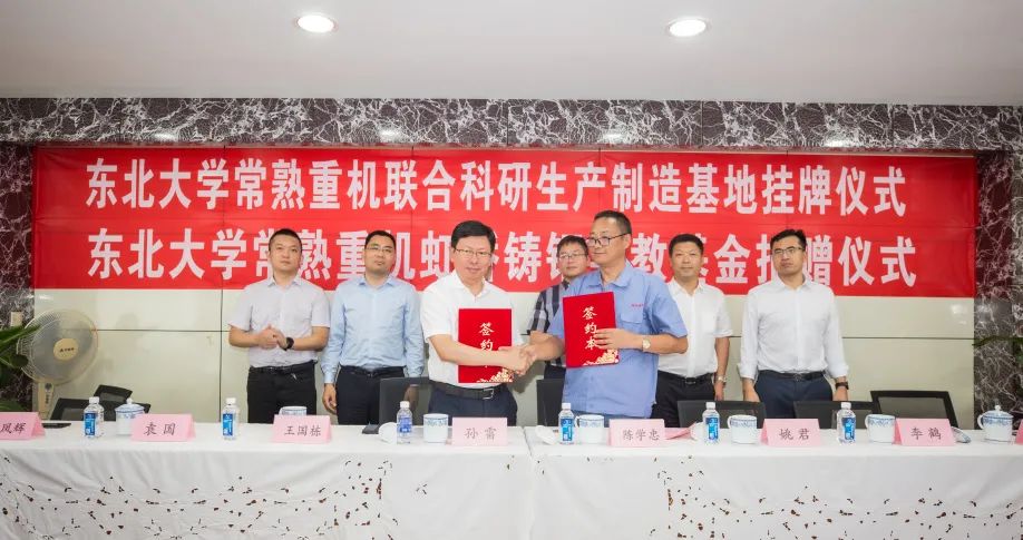(原新闻发布时间为:2021年9月30日)9月27号上午,东北大学常熟重型机械制造有限公司联合科研生产制造基地挂牌仪式暨东北大学“常熟重机虹桥铸钢”奖学、奖教基金捐赠仪式在常熟举行。东北大学副校长孙雷、中国工程院院士王国栋、东北大学对外联络与合作处处长李鹤、轧制技术及连轧自动化国家重点实验室主任袁国、常熟重机董事长陈学忠、江苏常熟高新技术产业园招商局局长姚君等领导出席仪式。东北大学相关部门负责人与常熟重机部分员工参加了签约仪式。