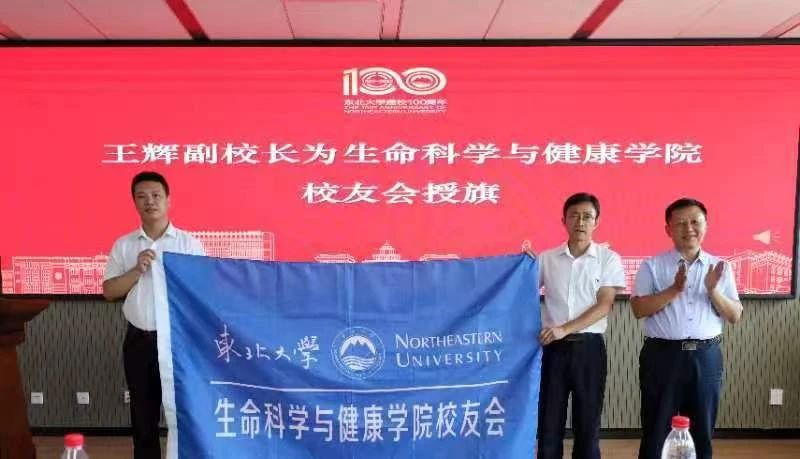 王辉为生命科学与健康学院校友会授会旗,并为生命科学与健康学院校友会会长、执行会长颁发聘书。东北大学校友总会副秘书长王晓英宣读了校友总会对生命科学与健康学院成立校友会的批复文件,为到场的学院校友会理事颁发了聘书。