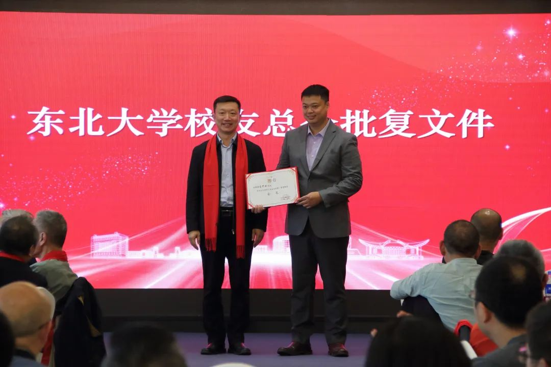 马天威处长宣读东北大学校友总会批复文件,并代表母校东北大学向四川省校友会授予会旗。