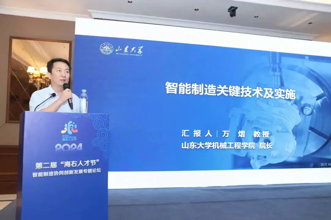 论坛还邀请了多位专家、企业家做专题报告。其中,大湾区大学(筹)教授于华围绕《钙钛矿太阳能电池产业化研究》主题作了主旨报告;山东大学机械工程学院院长万熠教授就《智能制造关键技术及实施》进行了深入阐述;济南大学人工智能研究院副院长郑飞教授作了《人工智能在智能制造领域的应用》主题报告;大汉科技股份有限公司总经理张茹则从企业视角出发,作了《智能制造与企业创新发展》的主题报告。