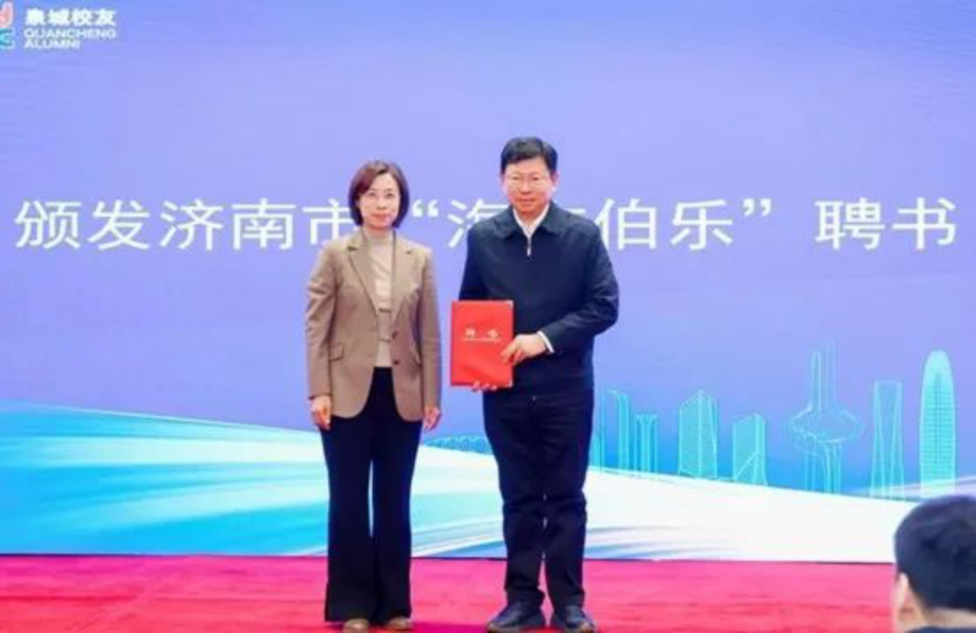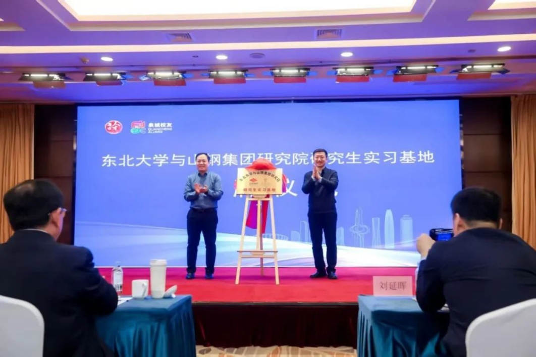 东北大学校长助理刘延晖,济南市投资促进局党组副书记、副局长、市委人才办副主任吴涛分别致辞,表达了对校地合作的高度重视与美好展望。济南市工业和信息化局党组成员、副局长、市委人才办副主任徐磊为东北大学原党委常委、副校长孙雷教授颁发“海右伯乐”聘书,进一步彰显了济南对人才的尊重与渴求。会上还举行了“东北大学与山钢集团研究院研究生实习基地”揭牌仪式,并为优秀校友颁发济南“校友双招双引大使”聘书,标志着校地企合作迈入了新的阶段。