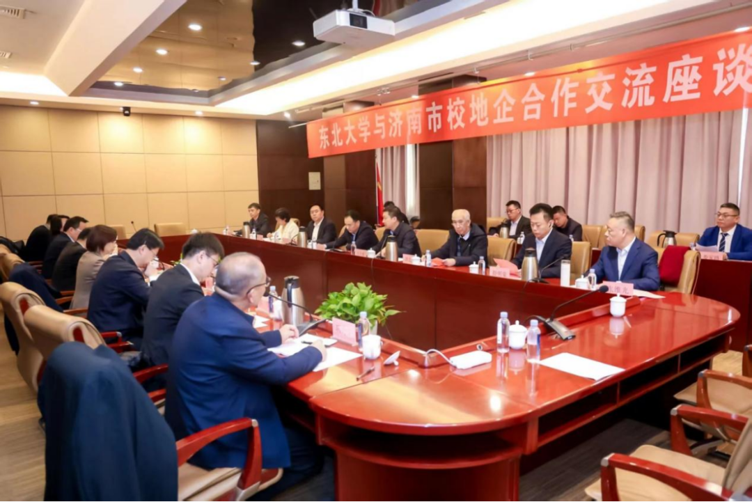 东北大学与济南市校地合作交流座谈会年会开始前,首先召开东北大学与济南市校地合作交流座谈会。会议由济南市工业和信息化局党组成员、副局长、市委人才办副主任徐磊主持,东北大学校长助理刘延晖出席会议并讲话,济南市投资促进局党组副书记、副局长、市委人才办副主任吴涛参加座谈。东北大学校友联络与服务处处长、校友总会秘书长马天威与济南市莱芜区、钢城区有关负责同志分别介绍了校地双方合作情况及合作意向。