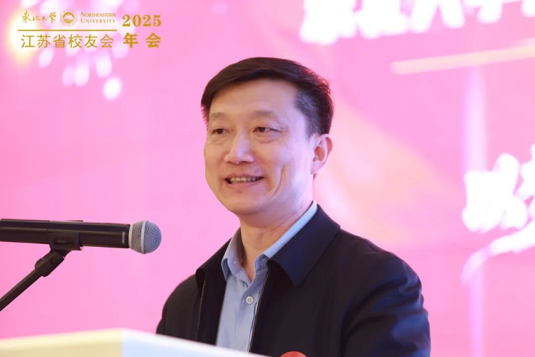 东北大学江苏省校友会顾问、东北大学杰出校友、南京航空航天大学校长姜斌致辞。姜斌对以东北大学校友和东北大学江苏省校友会顾问的双重身份受邀参会致辞深感荣幸,对此次2025年会的召开表示热烈祝贺,对在各行业耕耘的东大校友表达崇高敬意和新年祝福。饮水思源,母校是校友们心底共同的深刻烙印、精神灯塔和力量源泉。他指出,江苏省校友会成为联结母校、校友、地方之间的家园和桥梁,校友们是回馈母校、发展地方的闪亮名片、宝贵资源和中坚力量。作为南航校友会理事长,他希望东北大学和南京航空航天大学两校校友会在未来能够打造互联互通的暖心家园,进一步构建共生共荣的发展引擎,担当薪火相传的文化使者;双方校友开展更多务实合作,与地域特色深度融合,为强富美高新江苏的发展贡献新的更大的力量。